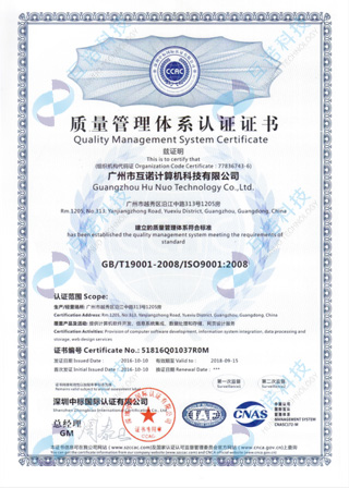 2016年,互諾科技通過(guò)了 ISO9001國(guó)際質(zhì)量管理體系認(rèn)證。ISO9001質(zhì)量管理體系認(rèn)證是對(duì)企業(yè)質(zhì)量把控體系的標(biāo)準(zhǔn)認(rèn)證,通過(guò)該項(xiàng)認(rèn)證,意味著互諾科技已經(jīng)擁有成熟的產(chǎn)品 質(zhì)量管理流程,能夠有效達(dá)到產(chǎn)品質(zhì)量改進(jìn)要求。也證明了互諾科技有能力、有實(shí)力提供符合社會(huì)質(zhì)量需求的產(chǎn)品和服務(wù)。